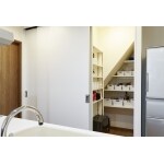 元の位置から大きく位置を移動し対面化をご提案しました。位置を変えたことで大型サイズのフルフラット対面キッチンの採用が可能となり、小屋裏収納への階段下のスペースを使ってパントリーを作ることにも成功しました。