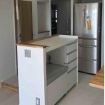 リビング入り口の扉を玄関方向へずらしたため、食器棚スペースがなくなりましたが、 キッチンと家電収納ラックのスライド引き出しで、食器類も上手に収納できました。