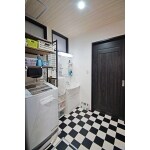 以前は廊下にあった洗面台ですが、今回のリフォームでは新たに洗面脱衣所を設けました。キッチンからの動線も考慮した配置になっています。外側に面していないため、玄関廊下からの光が入るように明かりとりの窓を設置しました。