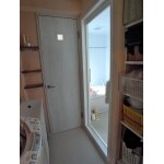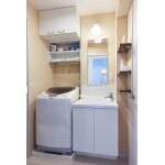 洗面所周りは周辺の間取を少し変えることによって洗濯機スペースを新設。ちょっとした空間を使って収納をできるだけ確保しました。 洗面化粧台もコンパクトなタイプですっきりと。 お風呂はユニットバスにすることで暖かさを確保しお手入れもぐっと楽になりました。 トイレは集合住宅特有の縦管を隠し、こだわりの内装材「ダイヤトーマス」で仕上げました。