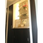 扉の交換はもちろんですが、ガラス扉を採用し、二人の想い出を後ろから照らすように間接照明を取り付けました。 もちろん収納のことも考え、ショーケースの下には物が置ける空間を設けております。