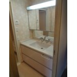 浴室リフォームと一緒に古くなった洗面化粧台の交換をお願いしたい。埋め込み収納を撤去し、三面鏡内に収納をしたい。ピンク色を基本色にご提案頂きたい。 洗面室の壁紙、床クッションフロアの張替も希望。