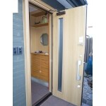 突風により破損してしまった玄関ドア。外壁・内壁をいじることなく施工可能な、工期も1日で可能なリフォーム玄関ドアを採用。以前は木製のドアのため反りで隙間があいたり断熱が良くありませんでしたが、高断熱のドアへ変更し断熱性能もあがりました。