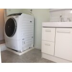 間口に対して、ドラム式洗濯機の配置に悩みましたが、ひっ付けると窮屈に感じるかなと思い、洗面台との間にスペースを取りました。