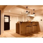 今回は極力物を置かずにゆったりとした空間を優先しましたので、吊戸棚を設けず開放的にし、ダストワゴンを有した必要最低限の家電収納棚を配置。キッチン自体に収納スペースは確保できるため、リビングと調和の取れたキッチンをご提案致しました。また、お客様より調理へこだわりたいとのことでしたので、IHではなくガスコンロを選定。機能性、収納力、開放感を伴ったキッチンに生まれ変わり、料理の楽しみも広がります。さらにカウンターテーブルの高さにもこだわり、PCデスクとダイニングを両立させたデザインとなっております。