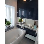 出窓部分のタイルは洗面室に使われているモザイクタイルと同じものが無く、色味が一番近いものを使いました。 洗面室と浴室の間の壁を洗面室側に移動し、今までより大きいサイズのお風呂になりました。