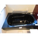 浴槽横の2段窓の下窓部分が壁になり、新しい窓やシステムバスで、保温効果の高い空間が完成しました。光沢のあるブラウンのアクセントパネルと、ブラックの浴槽がとても素敵です。