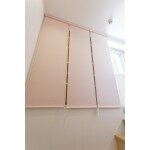 ロールカーテンを設置して、棚の中を隠せるように。天井までの高さがあったので、紐で調整できるロールスクリーンが効果的でした。明るいピンクもアクセントになっています。