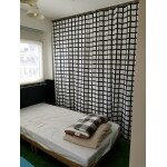 枕棚と半分だけ中段を設置し、様々な大きさの物に対応するように。扉ではなくカーテンで開け閉めも簡易に。