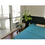カーペット仕様に。 バルコニー側だけフロアを貼り、グリーン置き場に。 このお部屋は腰下はクロスの上から濃紺で塗装しました。