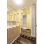 床はリビングや廊下とあわせて、壁紙は狭い空間を払拭するように明るい色に。化粧台は収納を重視した設備に交換しています。浴室の間取り変更を行っているため、洗面・脱衣所も影響受けて間取りを多少変更しています。特にお風呂、トイレへのスムーズな移動、扉の開閉に注意して、建具をそれぞれ折れ戸や引き戸などに変更させています。