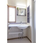 洗面所は浴室を広げるために、壁を解体して移築します。そのため、既存の化粧台を解体するだけでなく、配管を切り廻したり、新たに壁を作り入り口の枠を作ったりもしています。もちろん壁紙も床も張り替えています。 化粧台はシンプルなデザインにするため、TOTOのシステムJという設備を基本に、宝石のアメジストのようなタイルをあしらって棚などを造作しています。鏡も同様にお客様のお気に入りの鏡を設置しました。