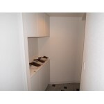床材はウォルナットの突板で全体的にシックで落ち着いた印象で統一しました。 収納を増やして欲しいとの事だったので、キッチン横(リビング奥)に大容量の収納を確保して、内部はパソコンデスクが収納できるようになっています。