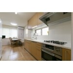 ダイニングスペースより、ゆったりキッチンスペースを見る。 背面のも大容量の収納を設けました。