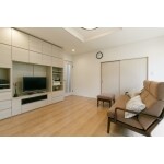 ダイニングとの間仕切りを引き違い→引込戸へ替えて有効開口を広げDKと一体感を持たせました。
