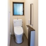 手すりと、立ち座りサポートの収納キャビネットで将来的にも安心