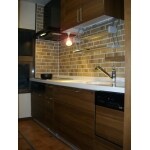 お客様のリフォーム後のイメージがはっきりしていたので、間違いのないようパースで確認しながらご提案しました。壁のタイルもキッチンの雰囲気に合わせレンガ調のものを張りました。照明や入口の建具なども、イメージを壊さないようなものでまとめました。