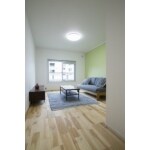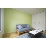 一面にあざやかなグリーンのアクセントクロスを貼りました。 部屋の印象がガラッと変わります。