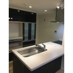上部の収納もなくし、横にあった仕切り壁もなくしました。 照明を増やしたことにより、とても明るくオープンな雰囲気になりました。 背面のカップボードも大容量にし、カウンターの色と統一して、メリハリのあるすっきりしたキッチンに仕上がりました。