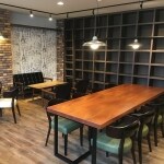 落ち着いたカラーのブリックタイルと木目調の床材を組み合わせることによって、落ち着きの中にも品があるアカデミックな空間に仕上がりました。 中央に設置した無垢のビックテーブルが好評でした。