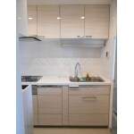 Panasonic リフォムスにお取替え。 扉カラーは明るい木目調のシェードホワイト柄をお選び頂きました。カウンターの高さはお客様の身長に合わせてH900mmに。 キッチン壁には200角のタイル(LIXIL ホワイトタイルコレクションⅡ RTM-200)とモザイクタイル(LIXIL インテリアモザイクニュアンス IM-25P1) 大きさの違う2種類のタイルを使ってアクセントをつけました。 ホワイトを基調としたシンプルなタイルですが、モザイクタイルには光沢のあるタイルがちりばめられ、お料理するのが楽しくなるようなキッチンが完成しました!