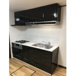 黒色の統一感があるキッチンになりました。床の色も明るくなり、カフェのキッチンのようなすっきりとした印象になりました。