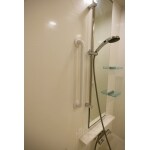 安全に入浴するためにも、浴室内の手すりは数か所に取り付けることをお勧めします。 1.出入り用縦手すり 脱衣室側 2.出入り用縦手すり 浴槽側 シャワー横 3.浴槽内立ち座り用手すり 写真中央 縦手すり