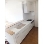 以前は、壁に囲われたキッチンスペースだった為、孤立していましたが、吊戸を撤去し周りの壁も撤去し、L型のカウンターを取り付けました。 キッチンの扉のお色味もホワイトベースの木目にし、天板は人造大理石にし、シンクはベージュにアクセントでさせて頂きました。