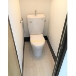 ホワイトのタンク式トイレへ交換しました。 凸凹も減り、お掃除がラクになったと大変お喜びいただいております。 壁紙はホワイトへ張り替え、床は木目調のやわらかい印象のベージュへと交換。 ナチュラルテイストな落ち着ける空間へと一新しました。