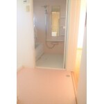 座っても柔らかい床材と、高断熱浴槽。キッチンと合わせたピンクの壁に浴室暖房乾燥機もお付けしました。