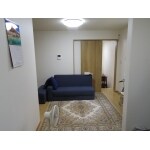 工事前の扉の部分の仕切りをなくし、1部屋として使えるようにしております。写真右奥はキッチンでその右手側に勝手口があります。