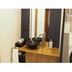 旦那様とおじい様がメインで使われる場所。 スペースの関係上、奥行が確保できないため、取り付けられる洗面台が限られてしまって悩まれていました。 しかし、「見た目はよくしたい!」というご希望を受け、染め色の黒のボウルをご提案。 紺色の壁は、弊社担当もお気に入りです!