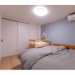 落ち着いた色味でまとめた寝室。ゆったりとした空間で、ベビーベッドも余裕で置けます。 1.5間の大きな収納を設け、数年に1度しか着ない衣類や季節の衣類、お布団などが仕舞って置けます。