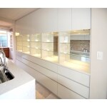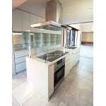 キッチンの両側にカップボードを設けた珍しいレイアウト。キッチン空間が通路を兼ねており、キッチンからリビングや洗面空間の両方に行くことができるようになっています。まさにキッチンを主役にしたレイアウトです。 扉はホワイトの塗装扉。取っ手のない手かけ式で、全ツヤ塗装の美しい扉をより惹き立ててくれます。食洗機はミーレの60㎝。操作パネルもホワイトで統一感があります。加熱機器はリンナイのデリシア(ガス式)と、その横に2口のIHを設けました。IHはお湯を沸かす際などに便利。その下にはガスオーブンを設置。電子レンジ機能付きなので、カップボードに電子レンジを置く必要がなくすっきりします。加熱機器のスペースが広い分、レンジフードは幅1200㎜と大きなサイズのものをご選定いただきました。加熱機器のサイドと背面にはガラスディバイダー(オイルガード)を設置しました。