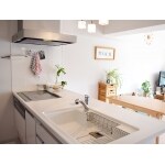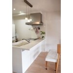 対面型に変更、リビングの雰囲気に合わせた清潔感のある白基調のお手入れしやすく使い勝手のよいキッチンに。 ペンダントライトがアクセントとなって、お客様らしい優しい雰囲気の空間に。