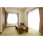 目積縁なし畳とクローゼット、障子ではなくカーテンにすることで、和モダンに。 窓を大きくとっているため、複合サッシにして断熱仕様に、そして電動シャッターで防犯面も考慮。