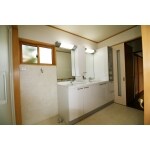 洗面脱衣室もこの位広いと使い易いですよね! 3帖の広さにして、2ボールの洗面台、トールキャビネットも設置し収納たっぷり、洗濯機も楽々おけるスペースを確保し、LDKに面する壁全面に、長い手すり兼タオル掛けを取付、安全に使っていただけるようにしました。