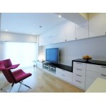 テレビボードとして、リビング収納として、家電収納として纏まりがありますので、スッキリして見えますね。炊飯器を引き出して収納できるスペースも設けています。 吊戸棚は、収納していたものを忘れてしまいがちな収納ですが、目が届く位置にあると、使い忘れがなくなりそうです。 白いキャビネットと扉を選定していますので、お部屋が広々と見えますね。取っ手はスクエアなシンプルな形状を選定していますので、モダンな雰囲気に仕上がっています。