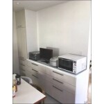 食器棚の配置と使い勝手が悪く、うまく収納できずにお悩みでした。 家電も多いためカウンタータイプのカップボードを提案。内装もきれいになりスッキリしました。
