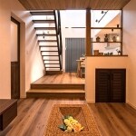 ご家族がくつろぐためのお部屋ですので、リビングとダイニングを間仕切らずに個室感を演出しました。 リビングが少し低くなるよう、ダイニングとの間に段差をつけることで視界に変化が生まれました。さらに、抜け感のあるグリッド棚で、奥行きを感じさせながら部屋を区切りました。観葉植物や雑貨を飾って、ソファでくつろぐようすをさりげなく隠す効果も。もちろん、日用品を仕舞える収納スペースも確保。 リビングの天井に貼った杉板が、独特のやわらかさや温かみを感じさせます。インテリアには、アジアンリゾート風のテーブルや観葉植物などをアクセントに。 目まぐるしい日常生活を忘れさせるような、ご家族一緒にくつろげる場所になりました。