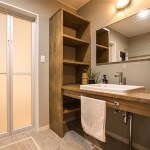 シックなグレイッシュカラーでまとめた洗面室。オーダーメイドの洗面台と大容量の収納棚で、木の温もりをプラスしました。 シンプルな洗面ボウルは、お手入れしやすい陶器製。160cmの広々カウンターに、横長の鏡を取り付け、朝の忙しい時間でも家族で共有して身支度できます。
