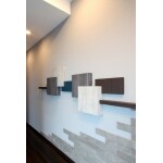 LDの一番目立つ大きな壁には造作家具によるモニュメントとアクセントクロス、エコカラットでダイナミックなデザインの装飾をご提案致しました。モニュメント部分はブロック形と直線をバランス良く組み合わせた斬新なデザインで、一部は開き扉収納になっています。直線部分の棚板はすっきりとした印象になるよう、取付のための金物を用いずに壁の下地材を挟み込む工法で浮遊感を実現しています。背面の壁は絶妙な色合いのブルーグレーのアクセントクロスに、質感のあるエコカラット・ラフクオーツを波を思わせるダイナミックな張り方にすることで、モニュメントを際立たせる演出にしています。