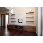 壁付けの55インチのテレビが取付けできるようにテレビ用金具の取付けをしました。コンセント類もTVの後ろに隠れるように設置したため、乱雑になりがちなコード配線もすっきり収納できます。 テレビボードの扉やカウンター素材は建具と同じウォールナット(突板)を採用していますので、一体感があります。幅3メートル超えの収納になりますので収納量もたっぷり。リビングや家族共通で使うものを収納しやすいように、引出収納と開き扉の収納も設けています。取っ手はカワジュン。 上から下に引き下げて使用するドロップダウン扉を採用した真ん中のガラス扉には、お気に入りのDVDなどがたくさん収納できます。壁面の棚板上には、左右に照明がついており、夜はより落ち着いた雰囲気に変化する木目が美しいテレビボードに仕上がりました。