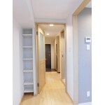 リフォーム後のリビングダイニングのドア 以前はリビングダイニング側にドアが開く形でしたが、玄関側に開く形にして、サイドに作り棚を設け、収納スペースを確保しました。