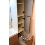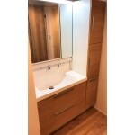ウッド調の素敵な洗面化粧台をご提案させていただきました。 水栓や洗面ボールも以前より使いやすく、見た目もスタイリッシュです。収納を増やしたいとのご要望がありましたので、同シリーズのキャビネットもご提案いたしました。こちらは、扉がスライド式で奥にしまった物もラクに取り出すことができます。