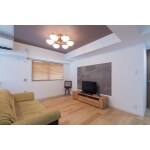 天井にグレーのアクセントクロス。そしてテレビの背景の壁にはお客様がお気に召した、グレーのエコカラット。「グレーを使うと空間が引き締まりますよ。」というプランナーからの提案です。空間の使い方が、カラーで決まりました。ここは気分を変えてくつろげるリビングです。床は無垢の風合いが感じられる突き板のフロアで仕上げ、ぐっと明るい雰囲気に。