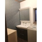 トイレと洗面はシンプルで機能的なもの。 当初の見積もりで選んでいたクロスは無地の物が多かったので、クロスのサンプルを探し、貼る面もアクセントをいれるなどし、個性を出しました。 洗面化粧台の扉カラーも合わせて落ち着いた印象を感じさせます。