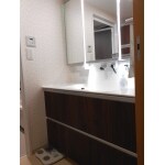カウンター下は大きな引戸タイプの収納で、シャンプーなどの買い置きをしまえ、ミラーキャビネットには化粧品や歯ブラシなど小物類をしっかり収納することができます。