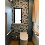 東へ3尺ほど移動し、洗面浴室を広げました。トイレの空間は手洗い器を設置しても以前より広くなっています。 トイレのクロスは最終的に悩みつつも、遊び心を持って決めていただきました。