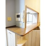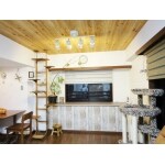 カフェ風インテリアにマッチするようリビング・ダイニングの天井は、もともと施工してあった腰高のアクセントクロスとも合わせて、木目柄クロスに。 キッチンカウンターも内装に合わせ、お好きなイメージに近い空間を実現しました。